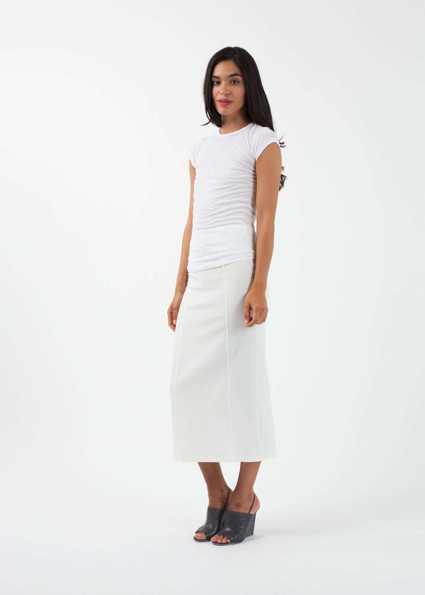 The Fitted Tee from Organic by John Patrick is your perfect summer go-to. This slim fitting piece is lightweight and durable. Capped Sleeves. Crew neckline. 100% Organic Cotton. Made in Peru. Ashley is wearing an X-Small.